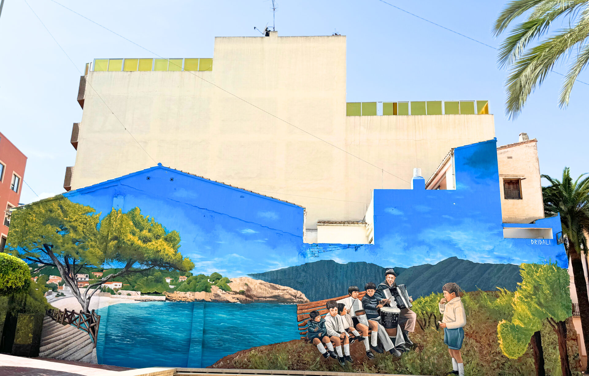 La concejalía de Imagen Urbana, dirigida por Adrián Cabrera, planteó el reto de pintar la enorme pared con un mural que representara gran parte de la esencia benissera. Dridali recogió el guante y, en tan solo una semana, la gran pared se ha convertido en una obra de arte que muestra el Paseo Ecológico a su llegada a la playa de la Fustera y se va diluyendo hasta dibujar la sierra de Bèrnia. En el centro del gran mural, Pere Bigot tocando el acordeón rodeado de niños del pueblo, una imagen extraída de una fotografía de Miguel Giner, el barber.